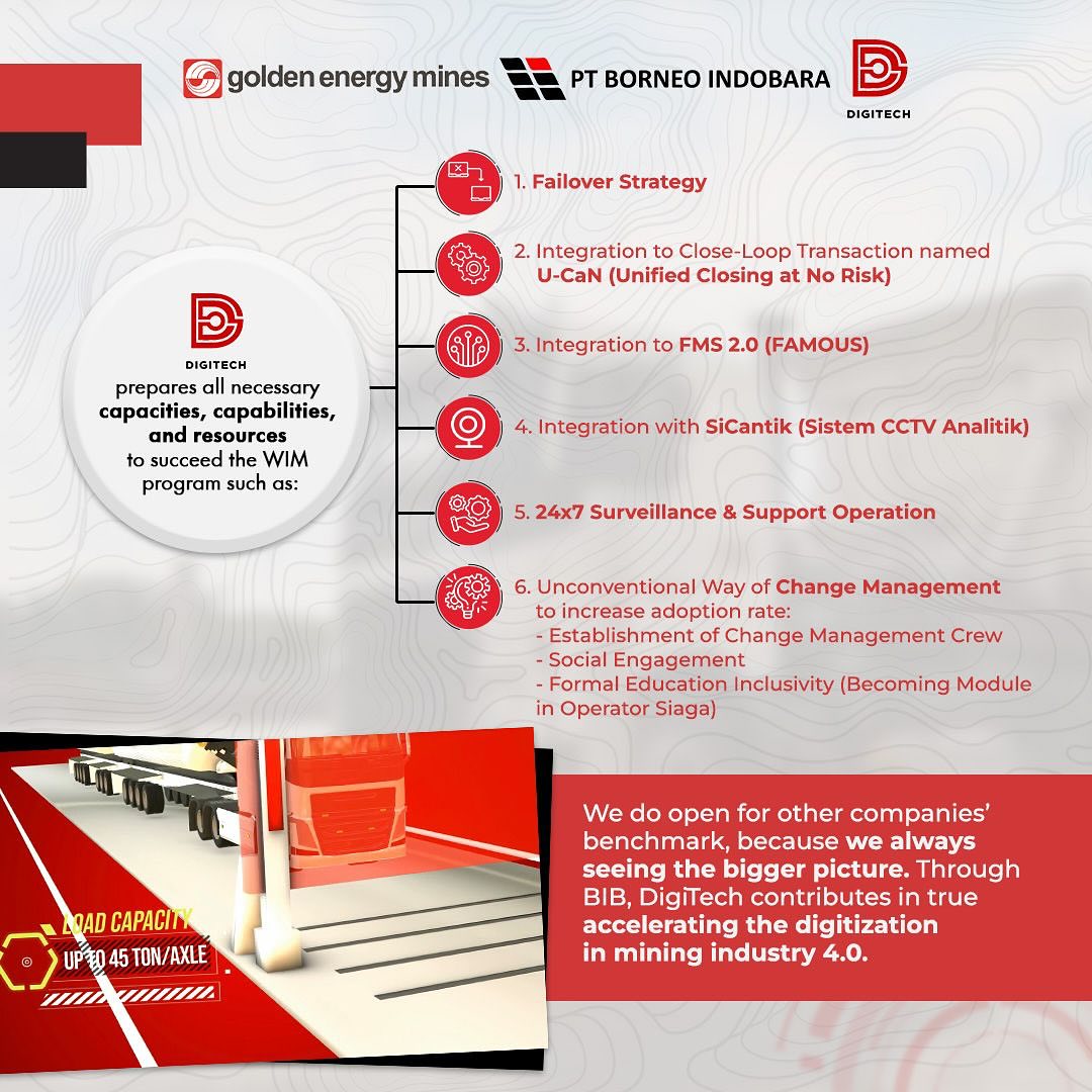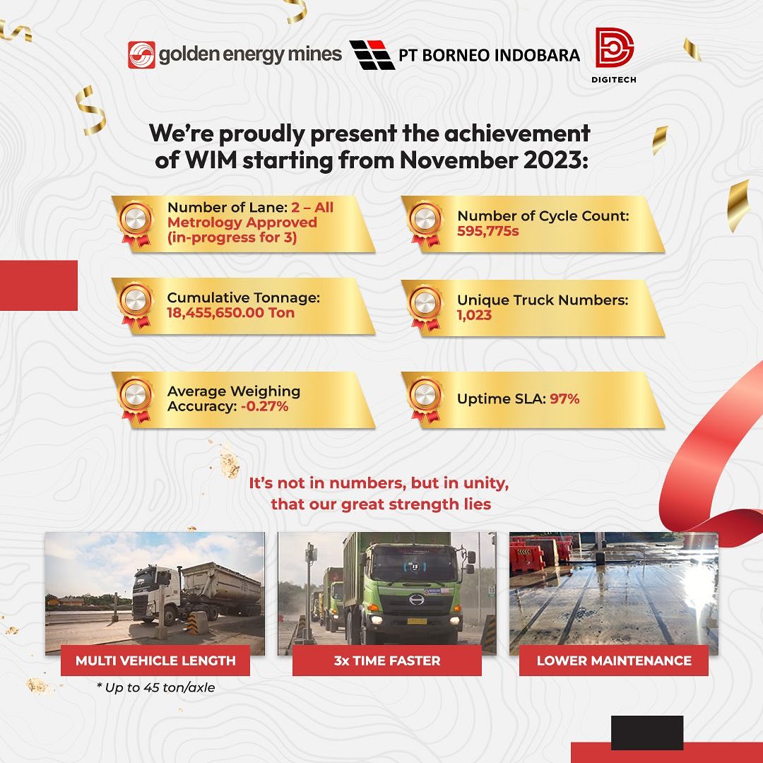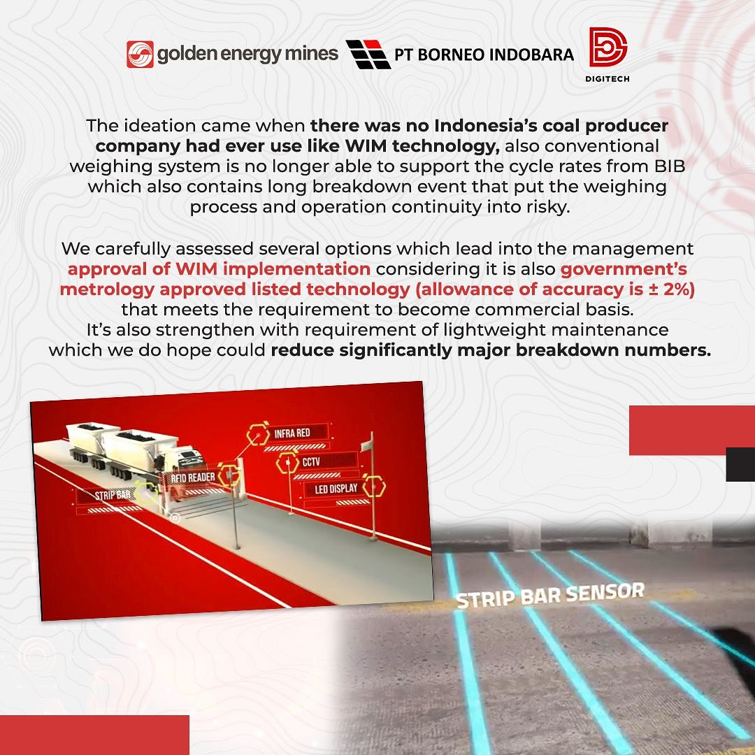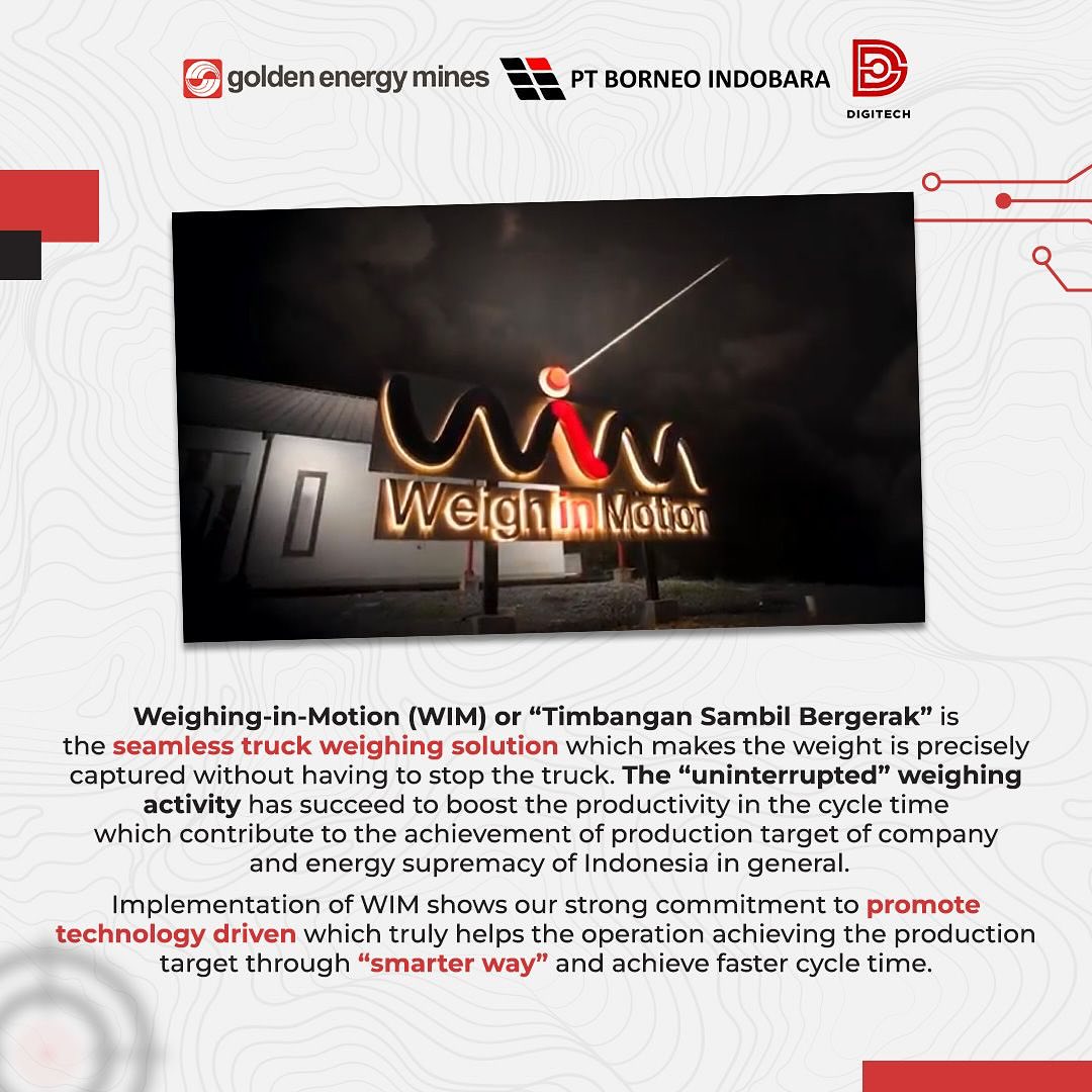 DigiTech created Weigh-in-Motion (WIM) – a seamless truck-weighing solution that records loads without stopping the truck. Implementing WIM is a good step towards smarter, faster operations and technology-based solutions. Hendro Sutrisno (Head of Digital Operations) said that PT Borneo Indobara (BIB) first implemented technology like WIM among coal producers in Indonesia. DigiTech is dedicated to continuous improvement and digital acceleration in mining. If you could create a super futuristic mining tech, what would it be and why? Share your coolest ideas with us! #TechConnect #GoldenEnergyMines #GEMS #BorneoIndobara #BIB #DigiTech #WeighinMotion
