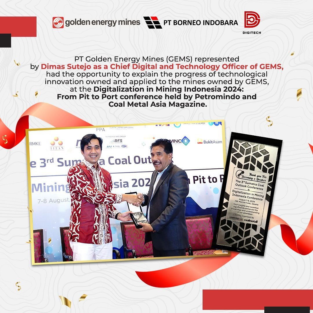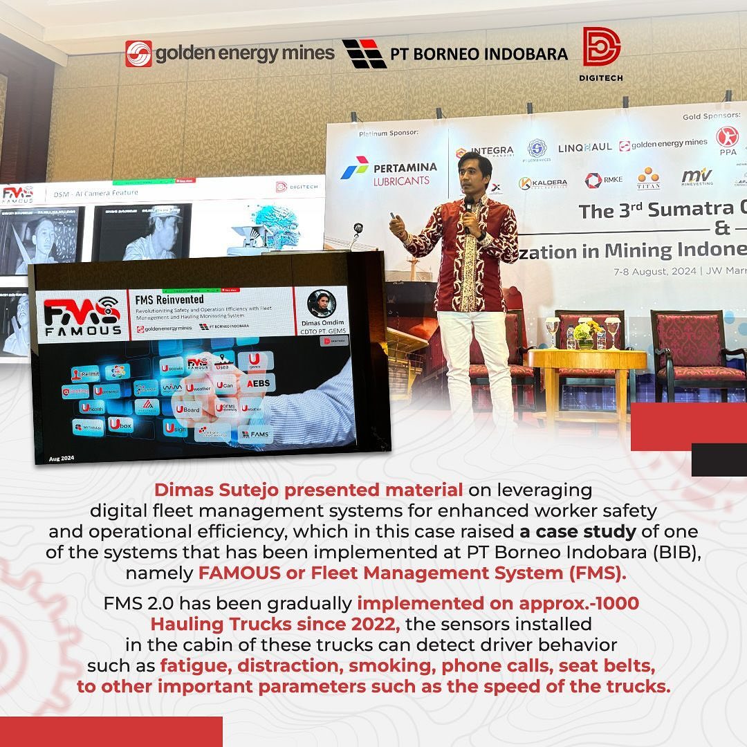 PT Golden Energy Mines (GEMS) attended The Digitalization in Mining Indonesia 2024: From Pit to Port Conference represented by Dimas Sutejo as a Chief Digital and Technology Officer. Dimas Sutejo highlighted a case study from the FAMOUS platform or Flat Management System (FMS). FMS can analyze the behavior of truck drivers to control and prioritize safety in mining. In terms of the digitalization of mining technology, the DigiTech team continues to innovate to become the vanguard and role model in the world of coal mining in Indonesia. #TechConnect #GoldenEnergyMines #GEMS #BorneoIndobara #BIB #DigiTech #FMS #FlatManagementSystem #MiningDigitalizationConference